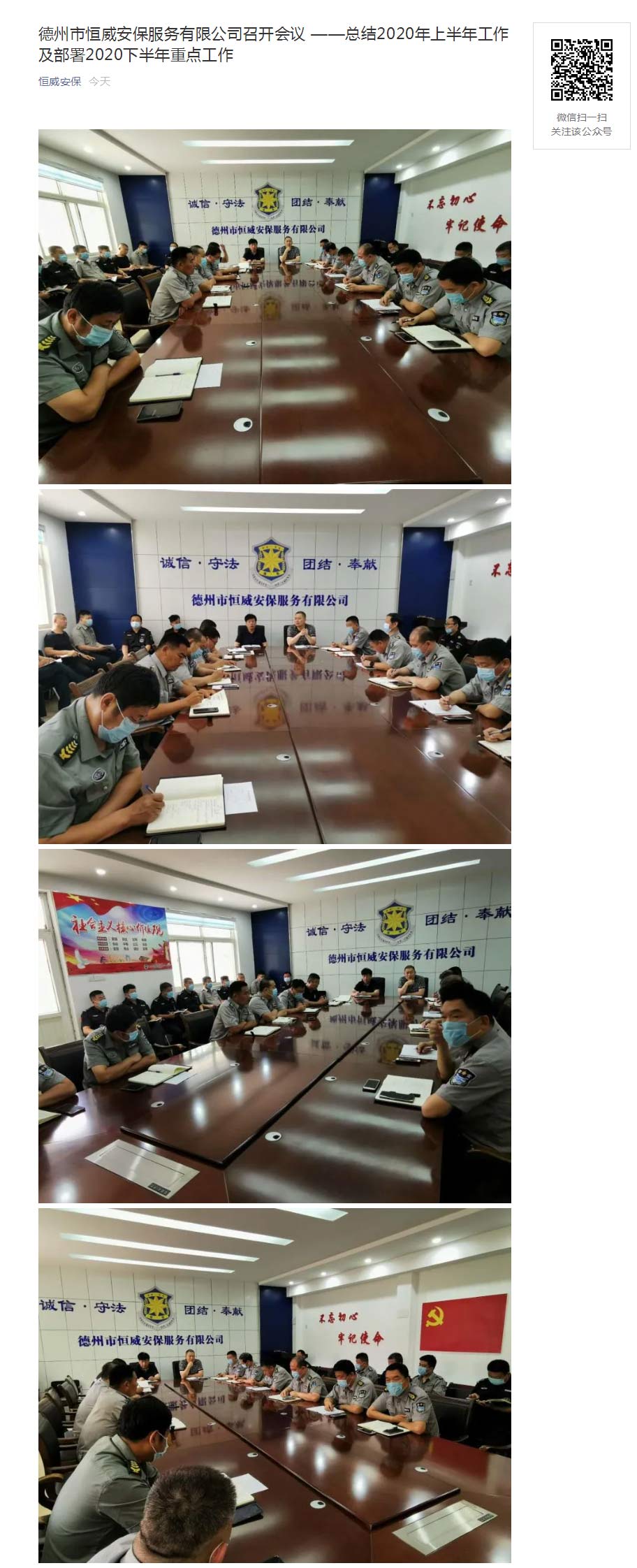 6月12日上午,德州市恒威安保服務有限公司王新衛(wèi)總經(jīng)理主持召開會議,總結2020年上半年工作及部署2020下半年重點工作。會議聽取了各職能部門及分公司負責人近期隊伍管理、人員增長、文明創(chuàng)城等工作匯報,公司中隊長以上管理人員參加會議。